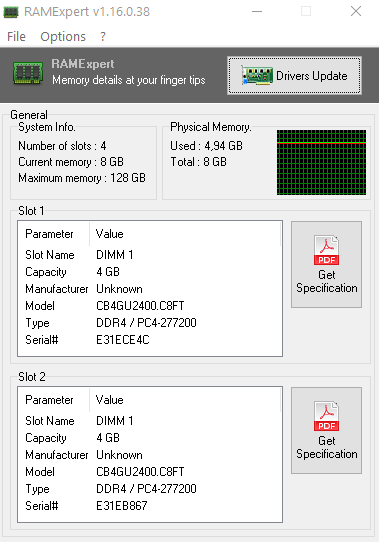 Bellek özelliklerinin yanındaki "GET specification" butonuna basıp detaylı bilgi elde edebilirsiniz. Mesela burada benim belleğimin üreticisi gözükmüyor. O düğmeye bastığımda üreticinin Crucial olduğunu görebiliyorum. Ayrıca üreticinin destek sayfasına bakarak detaylı bilgi elde edebilirsiniz bellek hakkında. Bellek modelinin sonuna "Support" ya da "datasheet" yazıp arattığınızda ulaşabilirsiniz bu bilgilere.