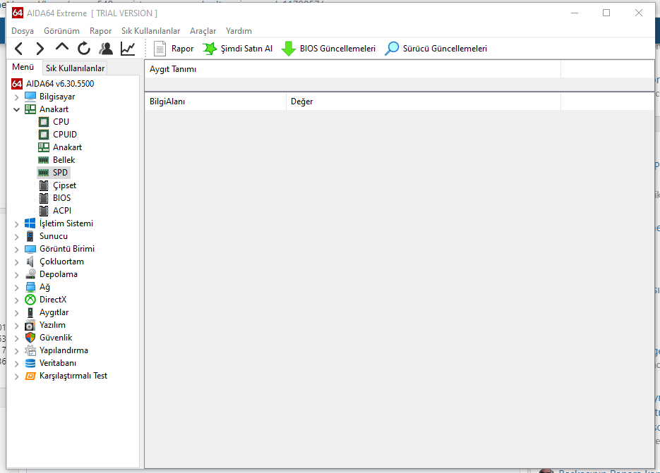 Bazen CPU-Z ya da AIDA64 üzerinden baktığınızda SPD sekmesi tamamen boş olur. Genellikle gömülü belleklerde bu sorunla karşılaşırsınız. Örneğin burada SPD sekmesi bomboş.