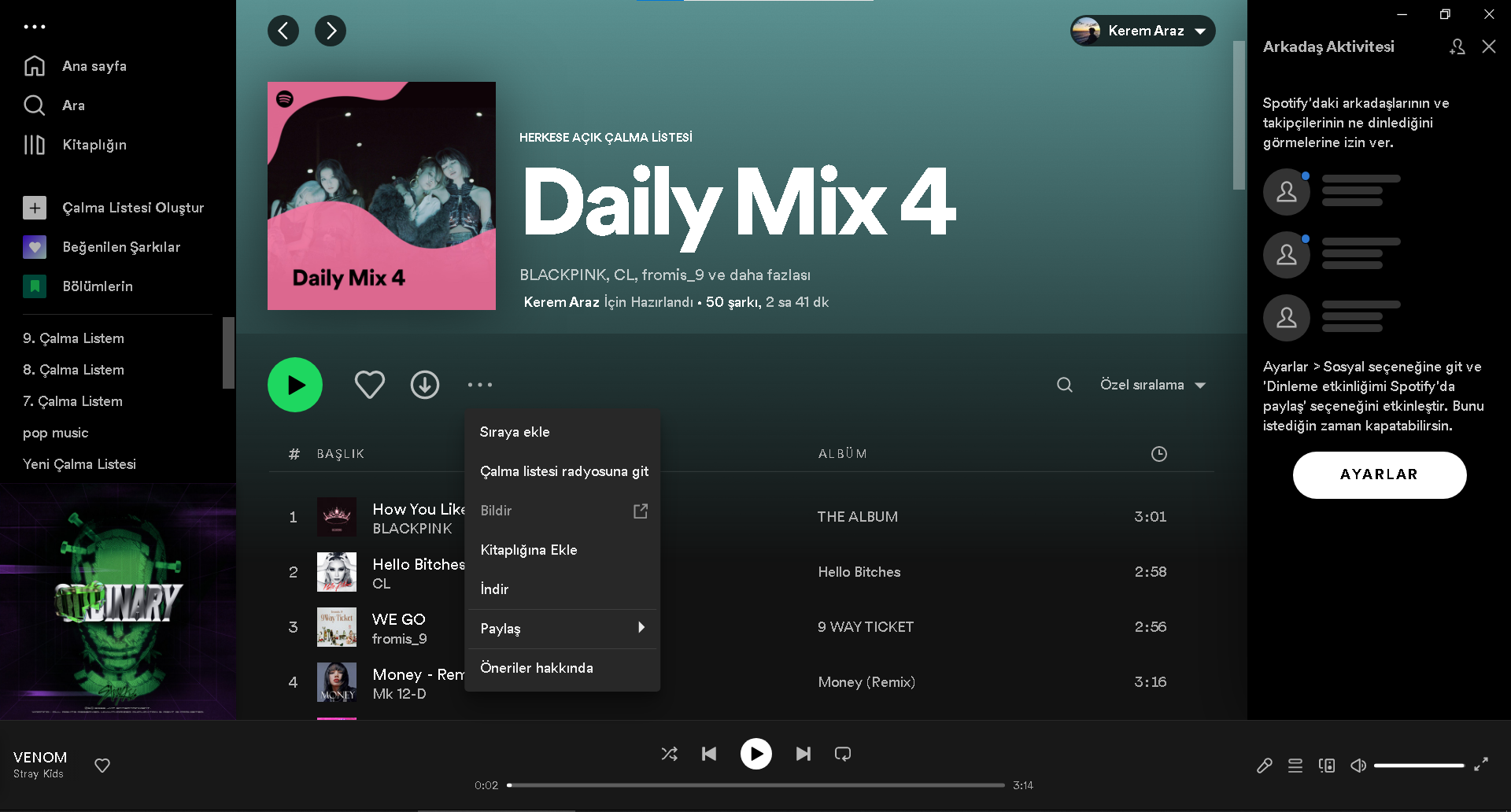 Daily Mix dinlediğiniz şarkılara göre belirleniyor onları silemezsiniz. Tek çözüm istediğiniz şarkıları dinlemek o şekilde düzenlenir orası.1 Haftaya yakın bilgisayarı kullanmadım kız kardeşim oyun oynayıp müzik dinliyordu. Spotify hesabımda saçma şarkılar dinlemiş ben silmek istiyorum ama beceremedim. Bilen biri varsa aydınlatabilir mi?