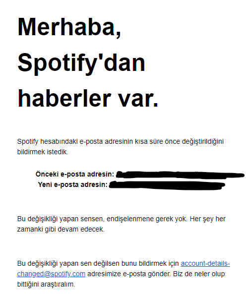 Hesabınıza birleşik krallıktan giriş yapıldıve bir sonra ki e-posta da ise Spotify'e postamın değiştirildiğini gördüm ve şu an hesaba giriş yapamıyorum.