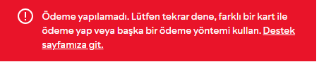 Spotify için Premium almaya çalışıyorum yaklaşık 6-7 aydır. Lakin satın alım aşamasında sürekli bu hata ile karşılaşıyorum. Ne yaparsam yapayım olmuyor; farklı kart kullandım, farklı cihazlardan denedim fakat gene olmuyor. Canlı desteğe yazmama rağmen tam olarak ilgilenmediler sadece kart bilgilerin internet alışverişine açık mı vb. şeyler deyip geçiştirdiler.