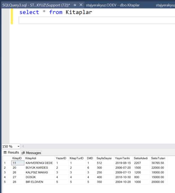 İlk önce ben Kitaplar diye arattığımda okey bunlar geliyor ama YAZARID KİTAPTURID DİLID kısımları gelmiyor.