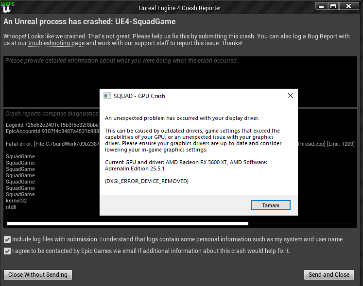 Sıkınısız oynuyordum geçen haftaya kadar sonra 2 gün önce görseldeki crashı verdi (2 saat oynadıktan sonra) ve GPU driverini otomatikman kaldırdı crashtan sonra. Bir daha girdiğimde bu sefer 5 dakikada crashı verdi. Ben de GPU sürücüsünü önce Driver Booster ile güncelledim yine crash verince bu sefer AMD: Adrenalin üzerinden güncelledim. Dün sıkıntısız oynadım yine ama bugün 1.5 - 2 saat oynadıktan sonra yine bu crashı verdi. Güncel driver: 25.5.1 şu anda ve AMD kendi sitesinde de en son driver bu.