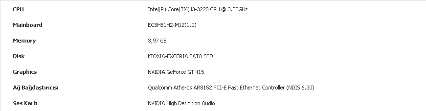 🖥️ PC: İntel Core İ7 3770 | GT 415 | HD 4000 | 16 GB RAM DDR3 1333Mhz | Quadro H61 Anakart | 300W PSU ATX | Samsung 870 EVO 250 GB SSD | Kioxia Exceria Sata SSD 480GB | Fury 128GB SSD | Toshiba MQ0ABD038 320GB HDD | Windows 10 Pro AtlasOS