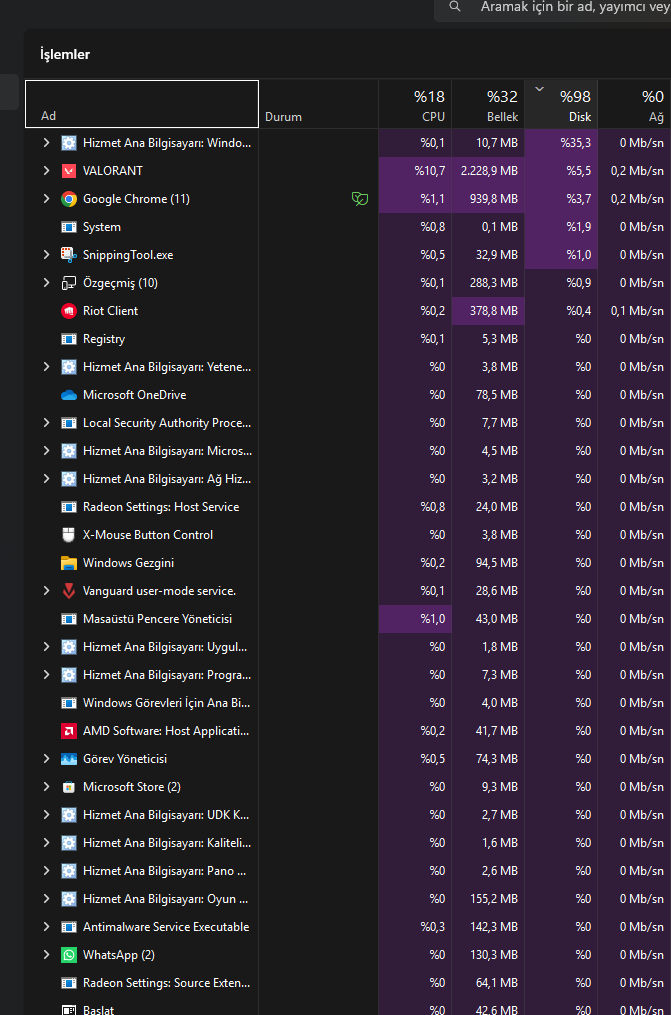 Merhaba, benim yaşadığım sorun çok garip. Bu konu ile ilgili birçok form inceledim lakin hiçbir sonuç alamadım. Herkes ssd/m2 SSD kullanıyorsanız böyle sorun yaşamazsınız diyor ama SSD kullanmama rağmen PC yeni açılmasına rağmen disk kullanımı "%80-90" arası geziyor. Aktif olarak kullanmaya başladığımda ise disk %90 altına inmiyor. HDD kullananlarda olur diyorlar bu sorun ama bende de oluyor. Hiç kullanmasam bile disk %90. bu yüzden sürekli oyunlarda takılma yaşıyorum diye düşünüyorum. Yani her türlü şeyi denedim. Gereksiz uygulamaları vesaire durdurdum ama ne oluyor anlamadım. Yardımcı olursanız sevinirim.