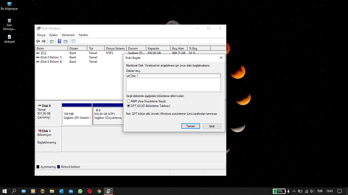Disk yöneticisini açtığımda ise disk başlatılmamış olarak duruyor (Resim 2). Diski başlat dediğimde Resim 3'deki hatayı alıyorum.