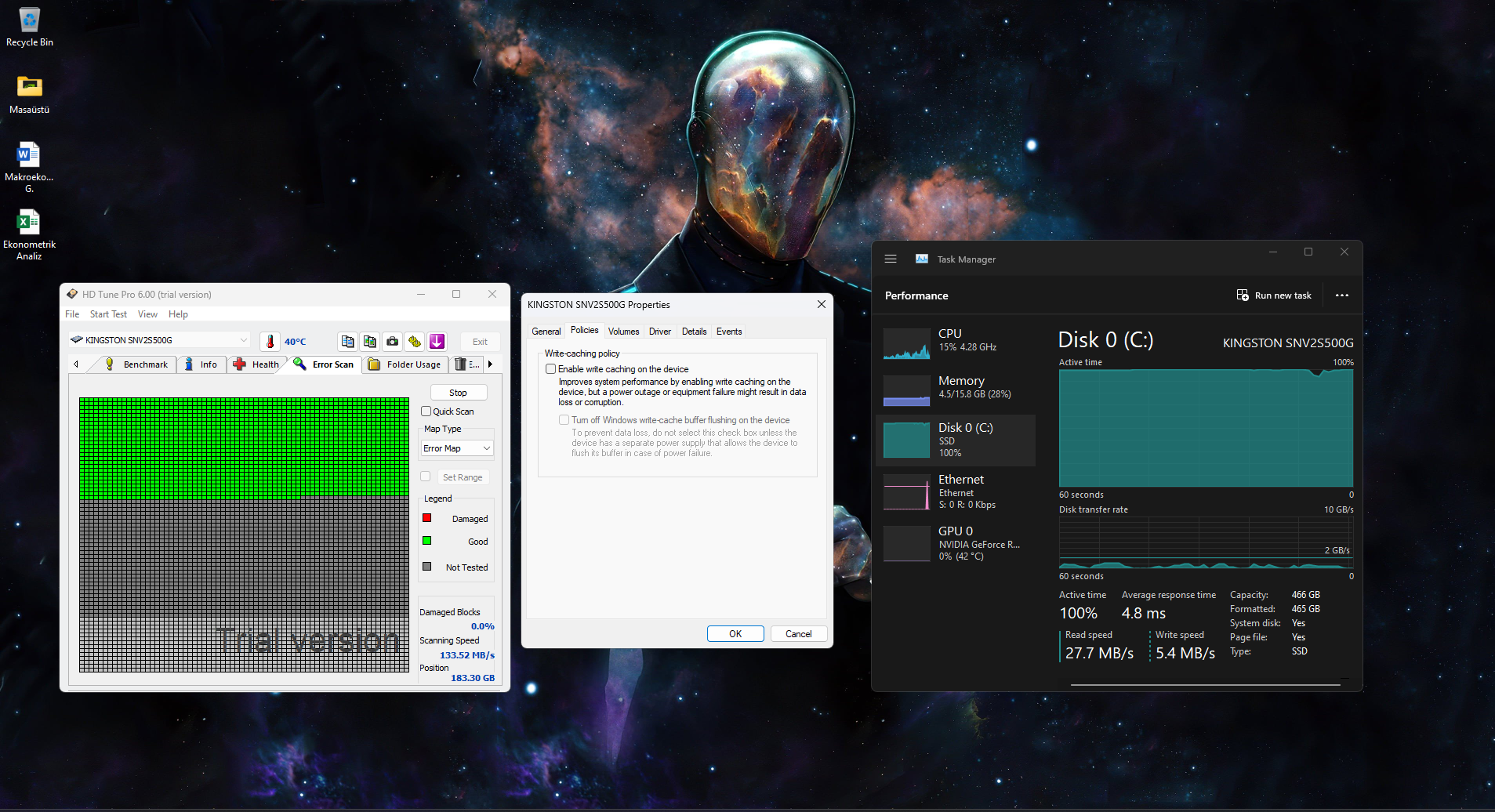 Görselde görebileceğiniz gibi scanning Speed 133MB/s, ancak bu hız 1 saniyeliğine böyle olup 40-50MB/s'ye ye kadar düşüyor. Uzun vadede yazma hızım hep 100 altında kalıyor. Ortadaki görseldeki "write-caching on the device" ayarı normalde default açık olarak gelmişti. O ayarı kapatmadan önce disk herhangi bir şey indirdiğimde direkt %100 oluyordu ve PC indirdiğim şeyi durdurana kadar 20-30 saniyelik donmalar yaşıyordu. Bu sorunu nasıl çözebilirim? 1600 MB/s bile görebiliyorum ama hızı koruyamıyorum. Hız grafiğinde uzun vadede 100 altıyım ancak kesik kesik 1000 üstü görüyorum o da 1 saniye sürüyor.