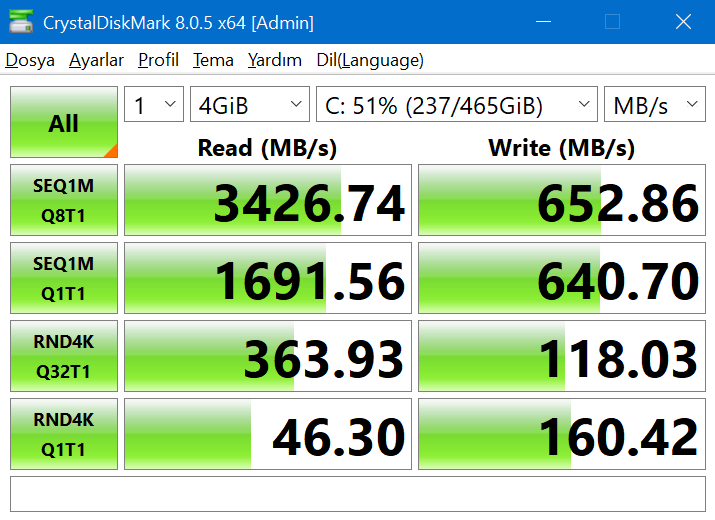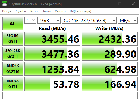 Merhaba. MSI SPATIUM M450 500GB (3600 MB okuma / 2300 MB yazma) M.2 SSD kullanıyorum. Alalı tam olarak 5 gün oluyor. Test amaçlı CrystalDiskMark programını indirdim ve diskin vadettiği değerlerin çok altında değerler aldığımı fark ettim. Sebebi ne olabilir veya bir çözümü var mıdır? Sizce iade/değişime göndermeli miyim?