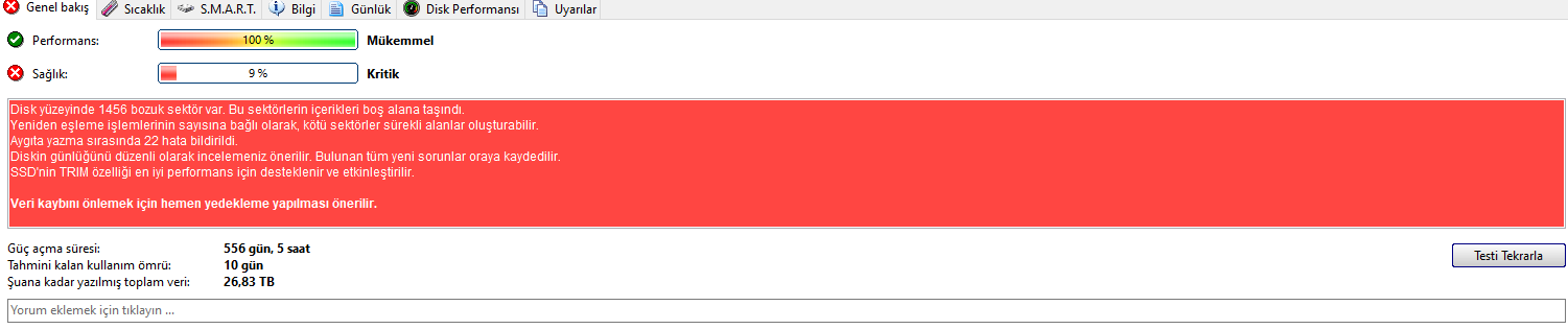 Arkadaşlar bu SSD yerine yeni bir SSD alınmalı mı yoksa ne kadar götürür resimleri yorumlar mısınız? 1456 bad sector var yazıyor. SSD Adata SU630.