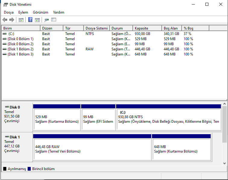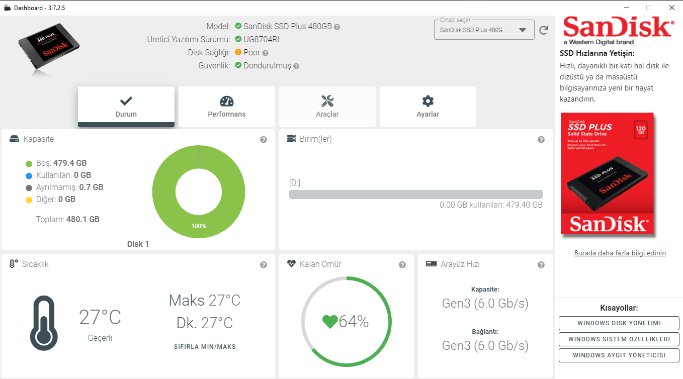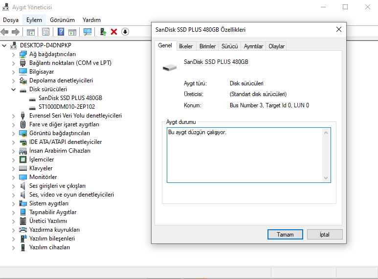 Şu anda aygıt yöneticisinde SSD Gözükmekte. Disk yönetimi kısmında ise Sanal Disk Hizmeti'ne bağlanılıyor... Demekte.