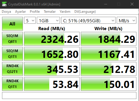 Sonuçlarımı aşağıda belirttim. Kullandığım SSD Crucial CT500P2SSD8 modeli. İnternetten baktığımda 2300-940 gibi bir hız belirtilmiş fakat aşağıda aldığım sonuçları görüyorsunuz bunun sebebi nedir acaba yazma hızı bayağı farklı gibi sitede belirtilenden.