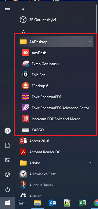Bu kısayollarda bir arada düzenli, alt alta olması için Start Menu, Programs klasörü içinde AADesktop diye klasör oluşturdum ve ihtiyacım olan kısayolları buraya taşıdım.