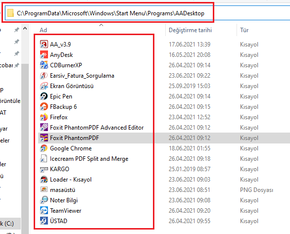 Start Menu\Programs\AADesktop\ornek.exe altında tekrar listelenmez.