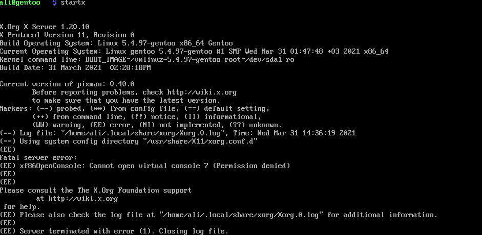 Root olduğum zaman startx ile session oluşturabiliyorum ama olmadığımda şöyle bir hata geliyor: