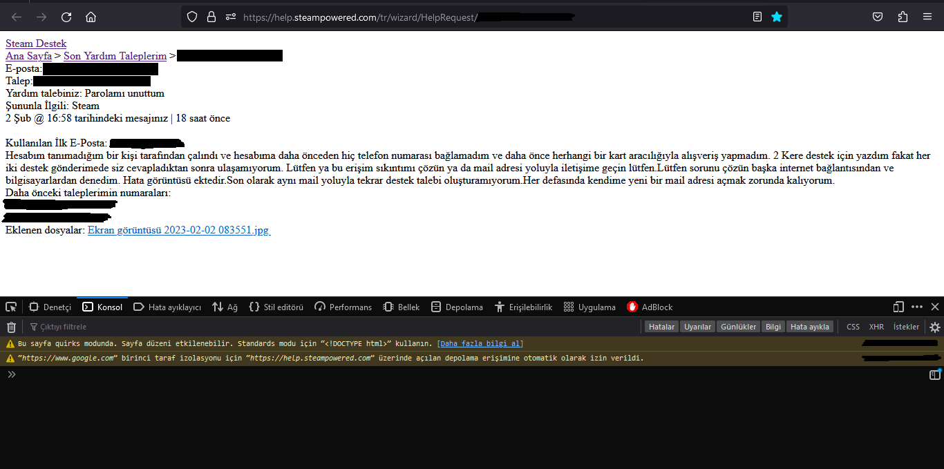 Arkadaşımın Steam hesabı birkaç gün önce çalındı. Daha sonra beraber Steam desteğe hesabım çalındı seçeneği üzerinden yazdık. Destek sekmesi Steam tarafından cevaplanmadığında normal gözükürken Steam talebi cevapladığında aşağıdaki gibi sayfa bozuluyor. Destek sayfası bozulduğu için gelen cevabı göremiyor ve yanıtlayamıyoruz. Aynı mail üstünden aynı talebi oluşturamıyoruz. Bu yüzden üç farklı mail adresi üstünden talep oluşturduk ama hepsinde aynı sorunla karşılaştık. Daha önce farklı tarayıcılardan, cihazlardan, farklı internet bağlantıları ile denedik ve sorun devam ediyor.