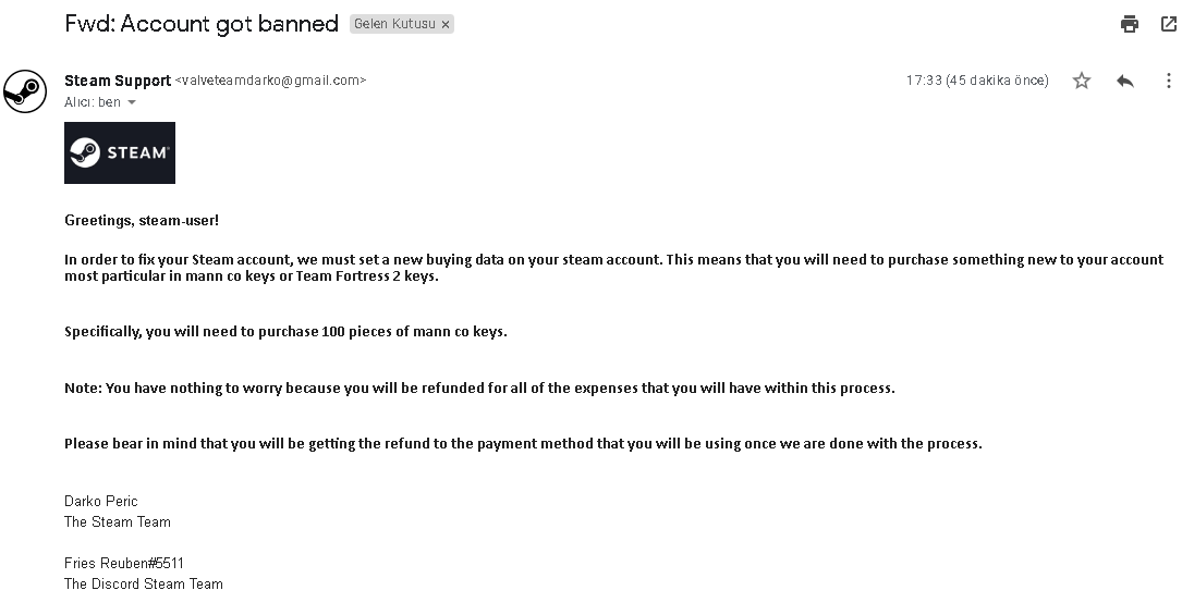 Doğru anladıysam size yazan kişinin arkadaşı hesabını şikayet etmiş bu durumda olacak tek şey hesabın inceleye alınır ve bir sıkıntı yoksa bir şey olmaz ayrıca size yazan Discord hesabını tanımıyorsanız Steam hesabınızı nasıl bulmuş olabilir? Gelen E-Postada gerçek değil inanmayın ve evet dolandırılmışsınız. Yapmanız gereken Steam Destek’e kanıtlarınız (Faturalar, key v.b.) ile birlikte yardım talebi göndermek ve gelecek cevabı beklemek.Arkadaşlar bana bir saat önce bir Discord hesabı bana yazdı ve dedi ki arkadaşım hesabını dolandırıcılıktan şikayet etti (İngilizce). Sonra bana detayları anlattı ne yapmam gerektiğini bana bir Discord hesabı verdi oraya yaz dedi. Ben de yazdım işte adam videolar attı hesabıma, yetki aldı nasıl yaptı aklım almıyor. Sonra bana bir mail geldi mail şöyle: