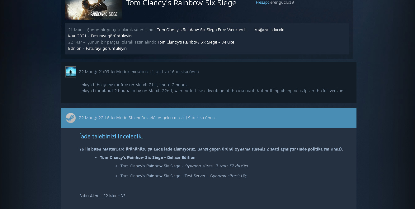 Arkadaşlar R6'yı ücretsiz olduktan sonra oynadım. Yaklaşık 2 saat olarak sonra indirim varken Deluxe Edition'u alayım dedim. Onu da yaklaşık 2 saat oynadım ( tam 2 değil) ama Steam parayla aldığımı ve ücretsiz alıp oynadığım saat oturumunu bir tutup ve toplamının 2 saati geçtiği için iade yapmıyor. Ne yapmalıyım? Talep gönderirken güzelce de açıkladım ama reddettiler 2 defa yolladım.
