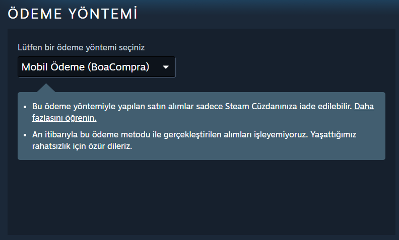 Steam'den mobil ödeme ile oyun almak istiyorum ama " bu ödeme yöntemiyle yapılan satın alımlar sadece Steam cüzdanınıza iade edilebilir. An itibarıyla bu ödeme methodu ile gerçekleştirilen alımları işleyemiyoruz. Yaşattığımız rahatsızlık için özür dileriz." diyor.