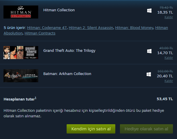 Envanterimde yok. Bu kanıya nasıl vardınız?Hitman Collection'ın içindeki oyunlardan biri envanterinizde olduğu için hediye edilmiyor, kalanları atabilirim.
