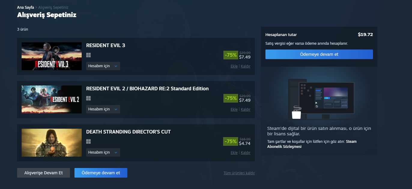 Resident Evil serisini 2-3-4-7-8 olarak oynamayı düşündüğüm için şimdilik 2 ve 3 ekledim bir daha ki indirimde seversem devam ettiririm. Önerdiğiniz oyun veya tavsiyeniz var mı?