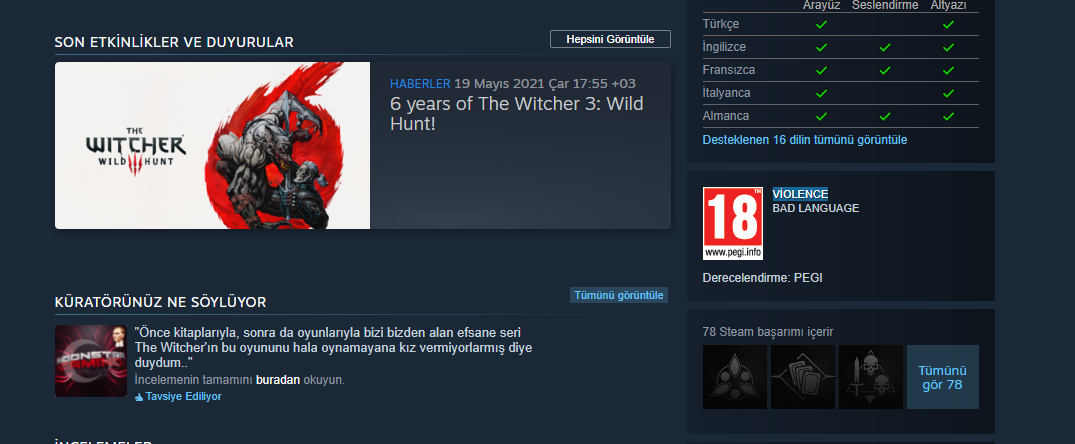 Steam The Witcher 3'ü Göstermiyor