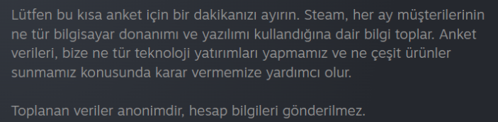 Anladım teşekkürler.Bu anketin kısaca amacı kullanıcıların sistemleri hakkında bilgi toplayıp veri oluşturmak. Ankete katılmanızın hiçbir zararı yok. Böylece yazıldığı gibi Steam bu verileri kullanıcıya yönelik yenilikler amacıyla kullanıyor. Bunun dışında oyuncuların en çok kullandığı ekran kartı modelleri hakkında falan veri tablosu oluşturuyor.