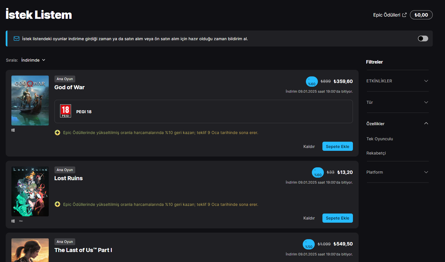 God of War: Ragnarok = Steam 49.99$ 1770TL - Epic Games 1499TL.