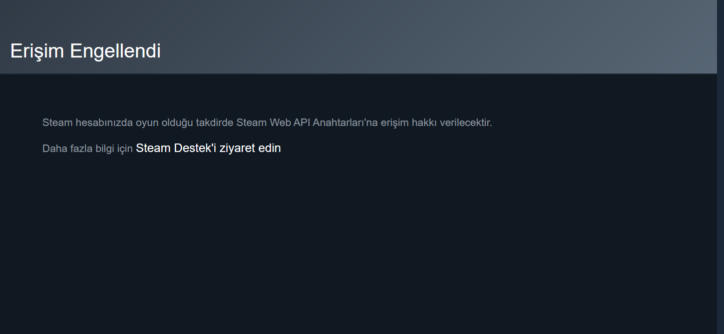 Sorunu buldum. Steam'de 5 dolarlık alışveriş yapmanız lazım. Aksi taktirde API anahtarı alamayacaksınız. https://help.steampowered.com/tr/faqs/view/71d3-35c2-ad96-aa3a