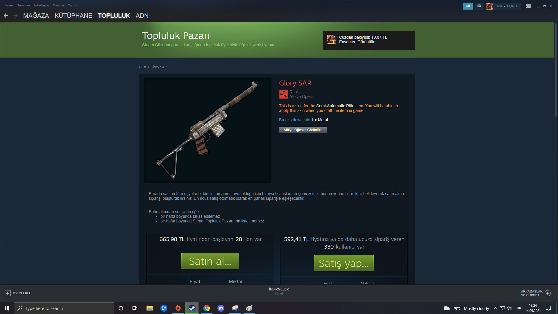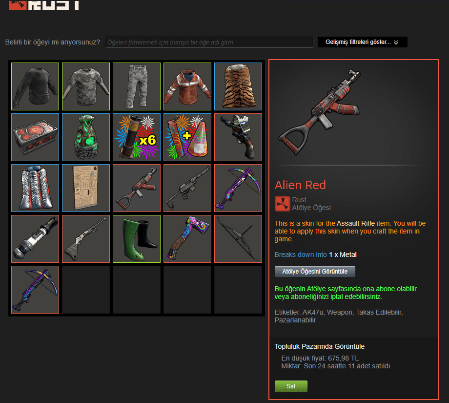 @rel0aded.sh Dostum konuyu hortlattığın için teşekkür ederim. Zamanında 500 TL'ye envanterime kattığım bir eşyayı örnek vermişim. Evet arkadaşlar, resimde 675 TL olarak görünen o eşyayı ben temmuz ayında 1700 TL'den sattım ve steam kesintisini düşünce 1475 TL civarında bir şey bıraktı. Yaklaşık olarak 3'e katlamışım. Resmini de şöyle bırakayım:İstediğin spesifik bir oyun varsa hafta sonu indirimlerinde de denk gelebilirsin. Ama en yakın major indirimi soruyorsan cadılar bayramında olacak. O da ekim sonuna denk geliyor. Peki benim steam hesabımda 100 TL olduğunda ben ne yapıyorum? Bunun da cevabı: param değer kaybetmesin diye kostüm alıyorum. Örnek vermek gerekirse Rust eşyalarından bu güne kadar 2-3 bin TL kaldırdım. En son 500 TL vardı hesabımda onunla da AK kostümü aldım. Şu an ortalama satış fiyatı 750 TL. Aynı mantıkla bütçene uygun ve piyasası hakkında bilgi sahibi olduğun bir kostümü alabilirsin.