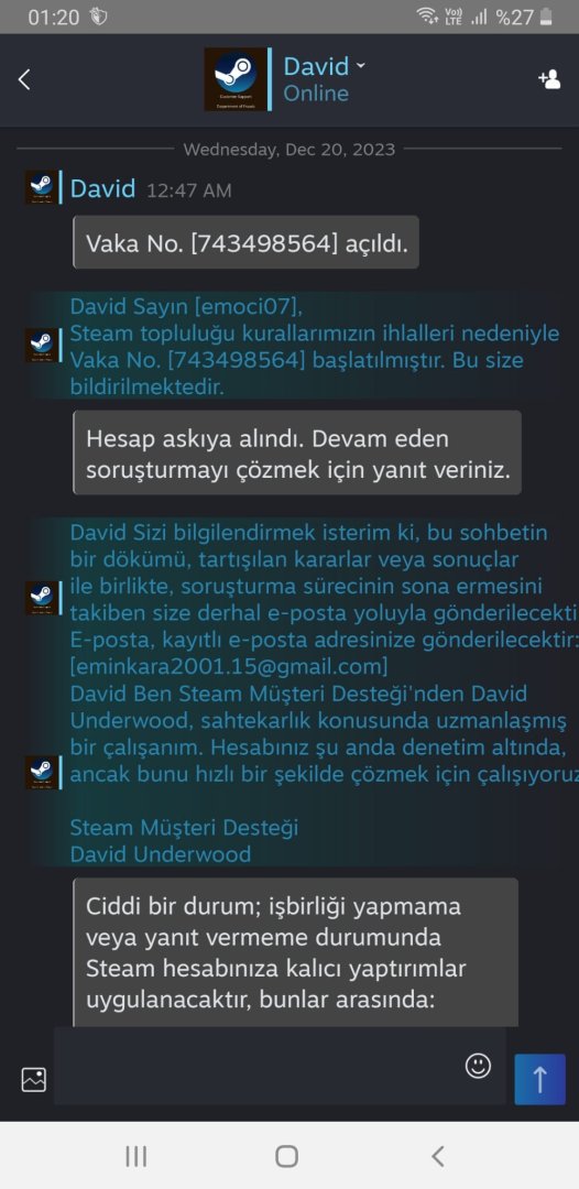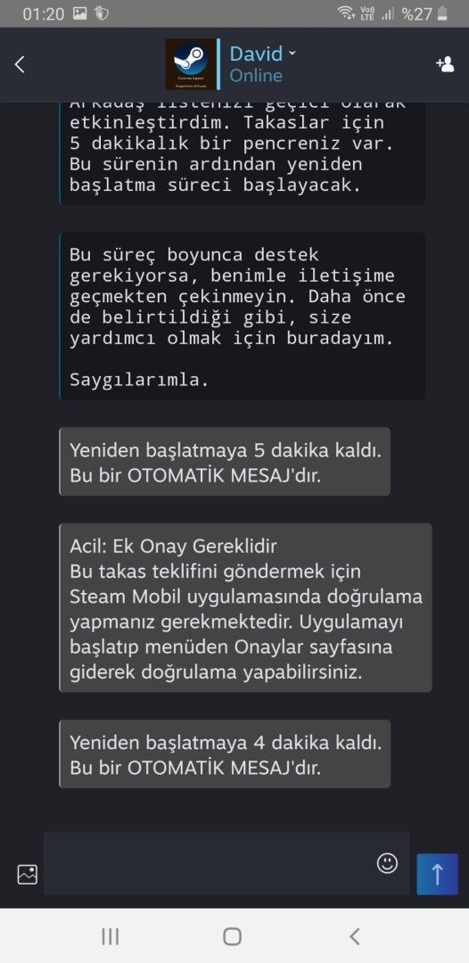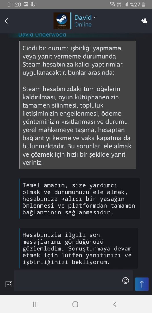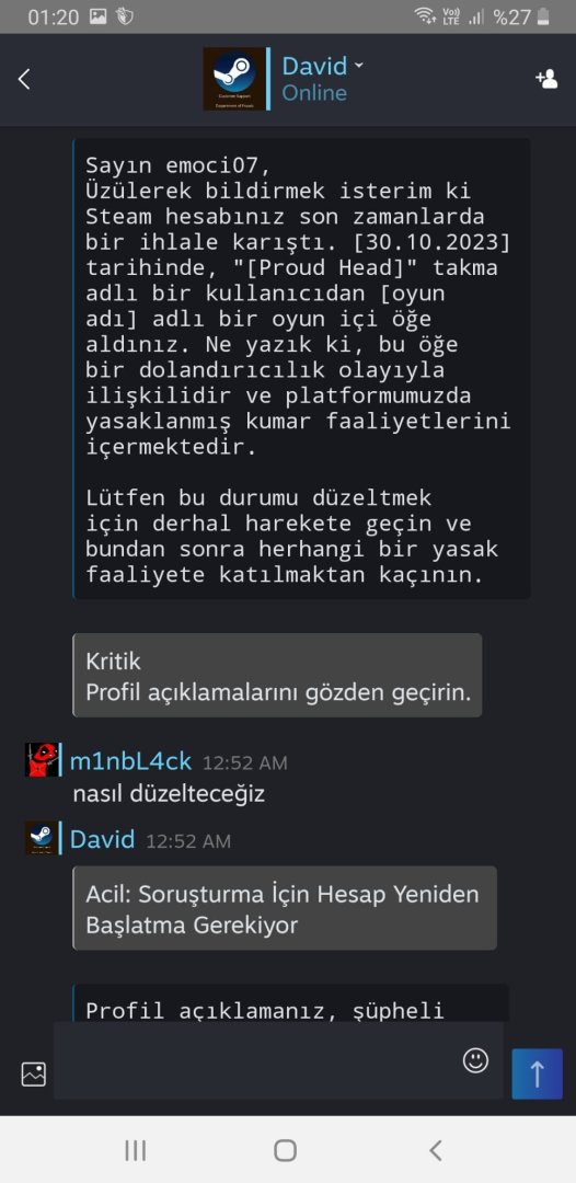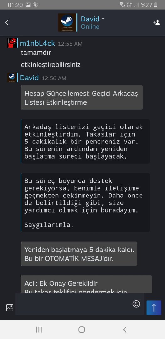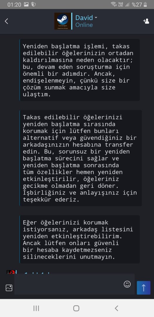 Arkadaşlar ilköncelikle Steam'den tanımadıgım biri bir anda benım onayım hiçbir şeyim olmaksızın beni ekledi. Geri çıkarmama rağmen anında geri eklendi önce Steam hesabımın adı numara oldu sonra oyunlardan tut yorumlara kadar her şey silindi. Önce hesabımı askıya aldı sonrasında arkadaşlarımı engelledi. Tabii bu süreçte de yazıyordu bana internette araştırdım ama bir şey bulamadım ve yaptıklarından korkmaya başladım. Hesabıma bu kadar etki edebiliyorsa gerçekten yetkili sandım en son arkadas lıstenızı 5 dakıkalıgına aktıflestırebılırım. Guvendıgınız bir hesaba itemlerinizi gönderebilirisiniz yoksa bu işlem sırasında kalıcı olarak silinecektir falan deyince yan hesabıma takas gönderdim ama başka bir hesaba gitmiş. Ne yapabilirim? Konuşmalar da burada.