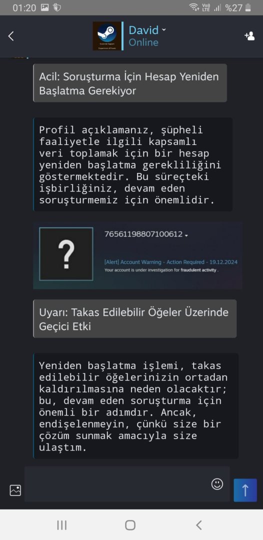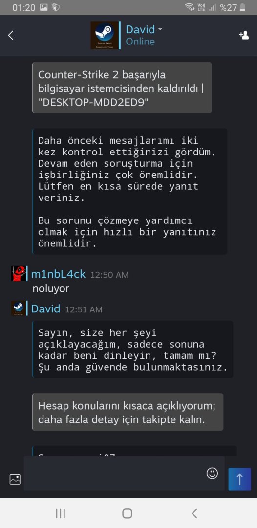 Arkadaşlar ilköncelikle Steam'den tanımadıgım biri bir anda benım onayım hiçbir şeyim olmaksızın beni ekledi. Geri çıkarmama rağmen anında geri eklendi önce Steam hesabımın adı numara oldu sonra oyunlardan tut yorumlara kadar her şey silindi. Önce hesabımı askıya aldı sonrasında arkadaşlarımı engelledi. Tabii bu süreçte de yazıyordu bana internette araştırdım ama bir şey bulamadım ve yaptıklarından korkmaya başladım. Hesabıma bu kadar etki edebiliyorsa gerçekten yetkili sandım en son arkadas lıstenızı 5 dakıkalıgına aktıflestırebılırım. Guvendıgınız bir hesaba itemlerinizi gönderebilirisiniz yoksa bu işlem sırasında kalıcı olarak silinecektir falan deyince yan hesabıma takas gönderdim ama başka bir hesaba gitmiş. Ne yapabilirim? Konuşmalar da burada.