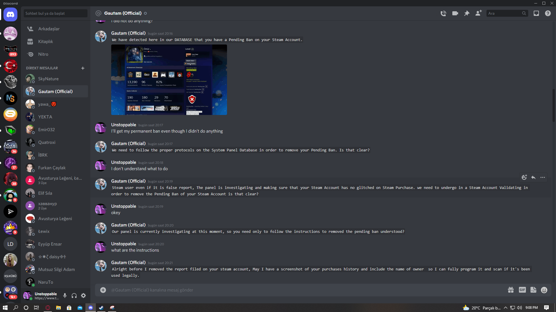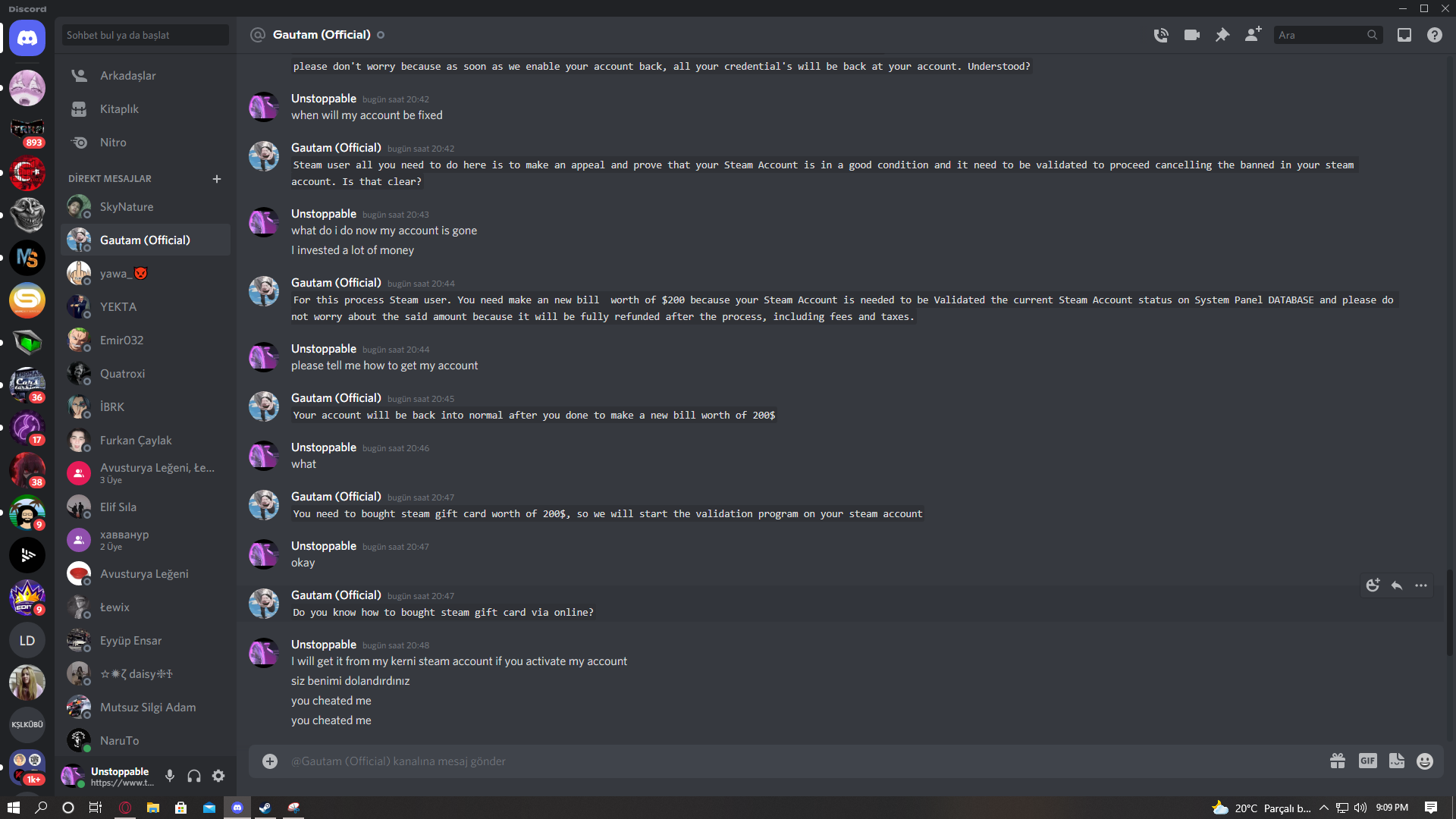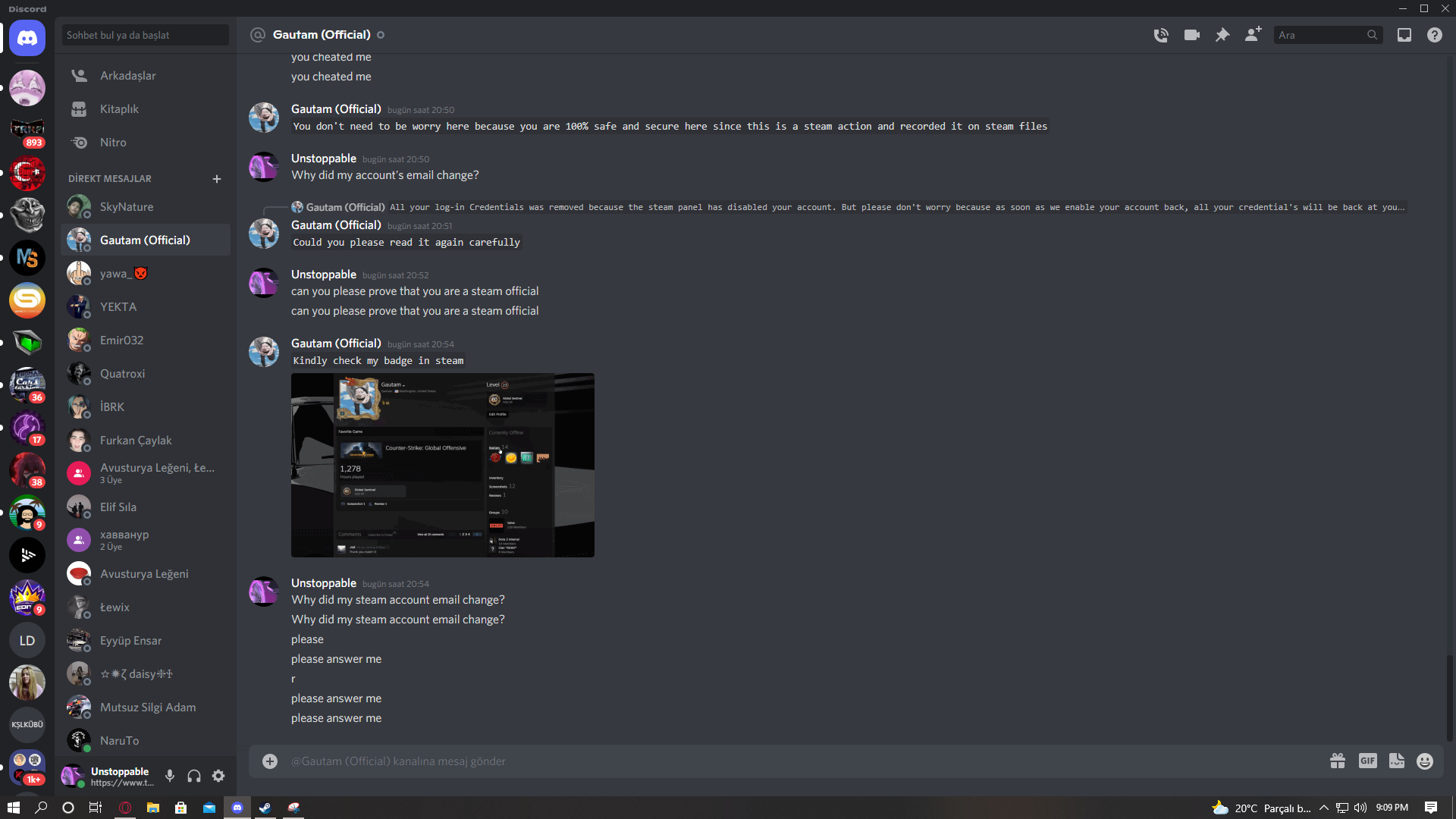 Nasıl bu kadar saf olabiliyorsunuz anlamıyorum Steam yetkilisi size neden orta parmak ppli bir Discord hesabından yazsın hani biraz düşünme kabliyeti olan anlardı.