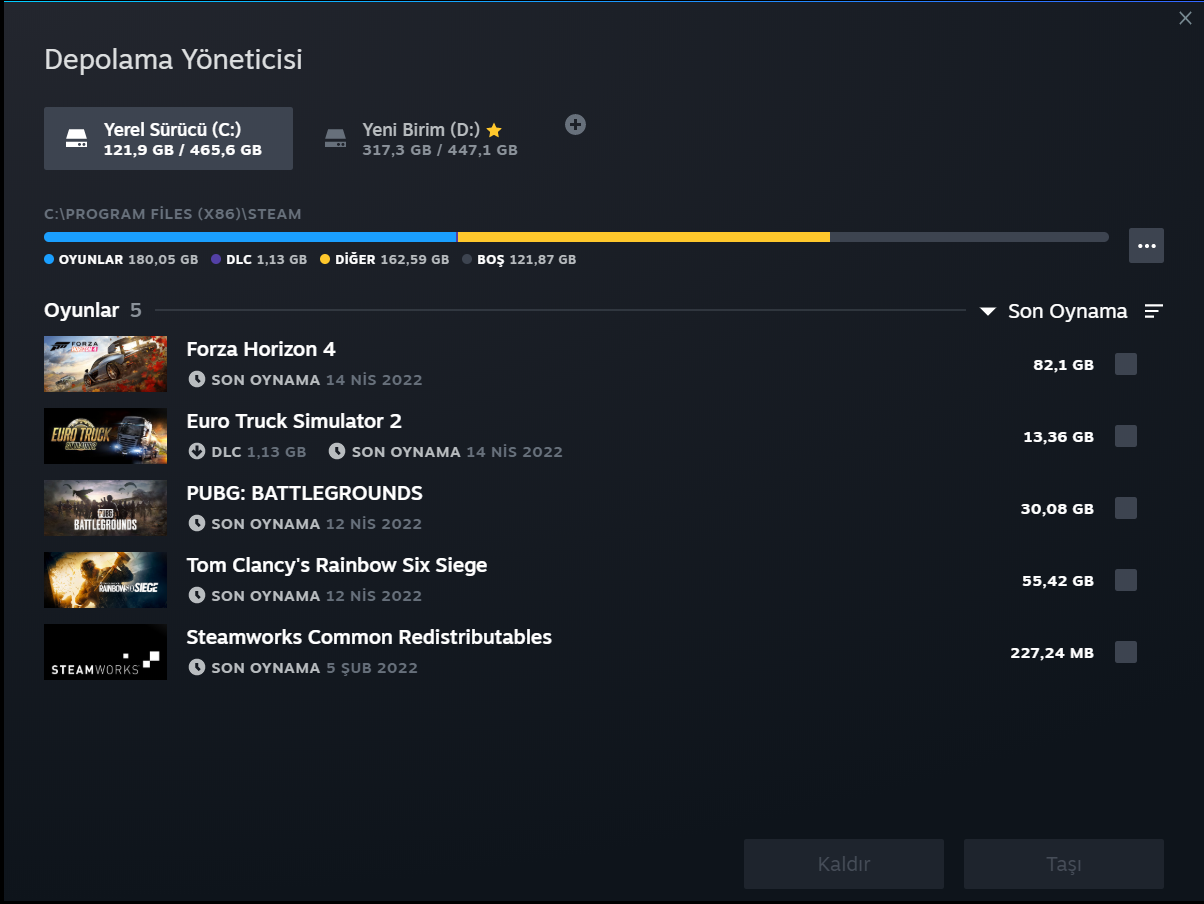 Ben o kadar alan kullanmıyorum ki 160GB olamaz imkanı yok. Sistem dosyaları desek ayrıca FPS oyunları var steam dışı Valorant vs.Senin bilgisayarında kullandığın alan.
