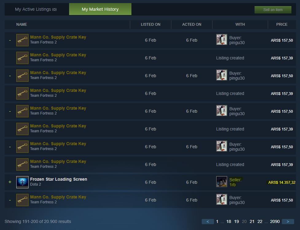 Steam hesabımın para birimi ARS. Bu ekranda satışlar ve aktarılan paraların toplam miktarı. ~ARS$140.000 (~12-13.000 TL) değerindeki itemler 3'te 1 fiyatına satılmış ve aktarılmış.