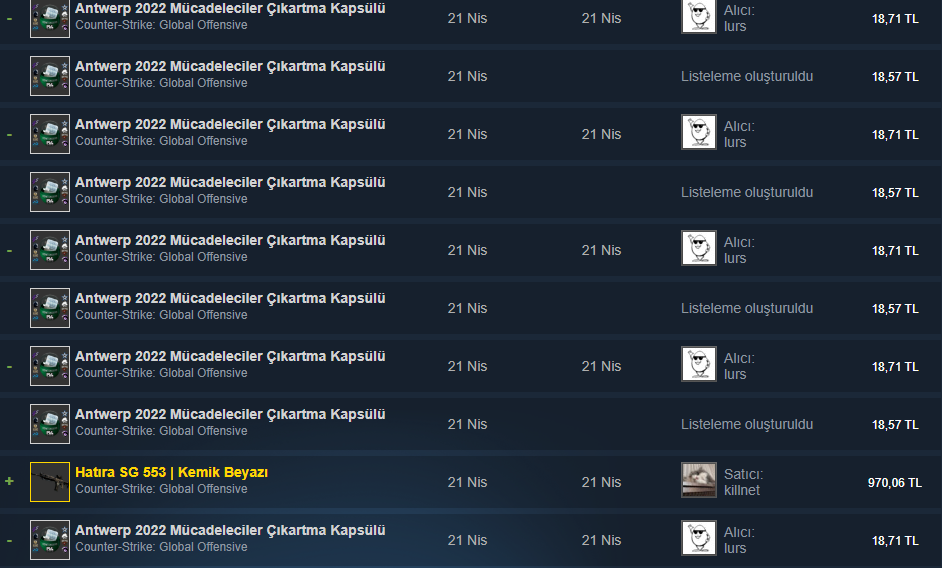 Geçmiş olsun hocam 2 hafta önce aynı yolla bende dolandırıldım. Zararım 8K TL civarı aynı şekilde itemleri 1 dolar altına koyduğu için, onaylama gitmeden direkt satılıyor ve kendi hesabından itemleri alıyor. Bu durumu sizde yaşadınız tavsiye ettiğiniz bir şey var mı? Beni dolandıran hesap parayı hala aktarmamış hesabında duruyor.