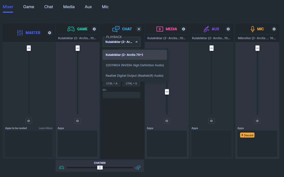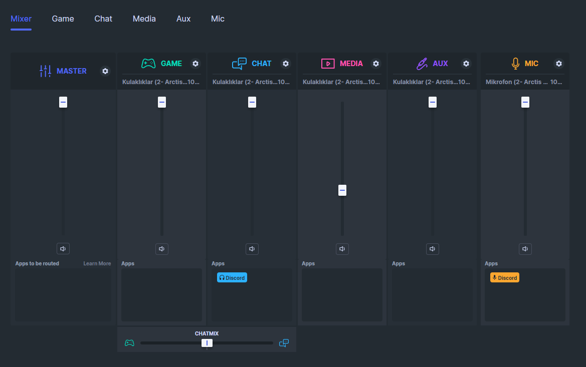 Biraz geç cevaplayacağım ama kendim için sorunu çözdüm. Arctis 7 kullanıyorum, sonarda Game kısmını kulaklıklar(Arctis X Game) olacak chat kısmı ise kulaklık işitme bölümü olacak böyle yapınca alttaki chatmix kısmı silik gözükmeli denemek için en kolay yol YouTube'dan bir video açın ve Spotify'dan da bir müzik açın Spotify'ı sonarda chat kısmına sürükleyin chatmix tekerleğini kaydırın işe yaraması lazım eğer hala işe yaramıyorsa kulaklığı başka bir USB portuna takın ben flash USB kısmına taktım ve sorunu çözdüm.