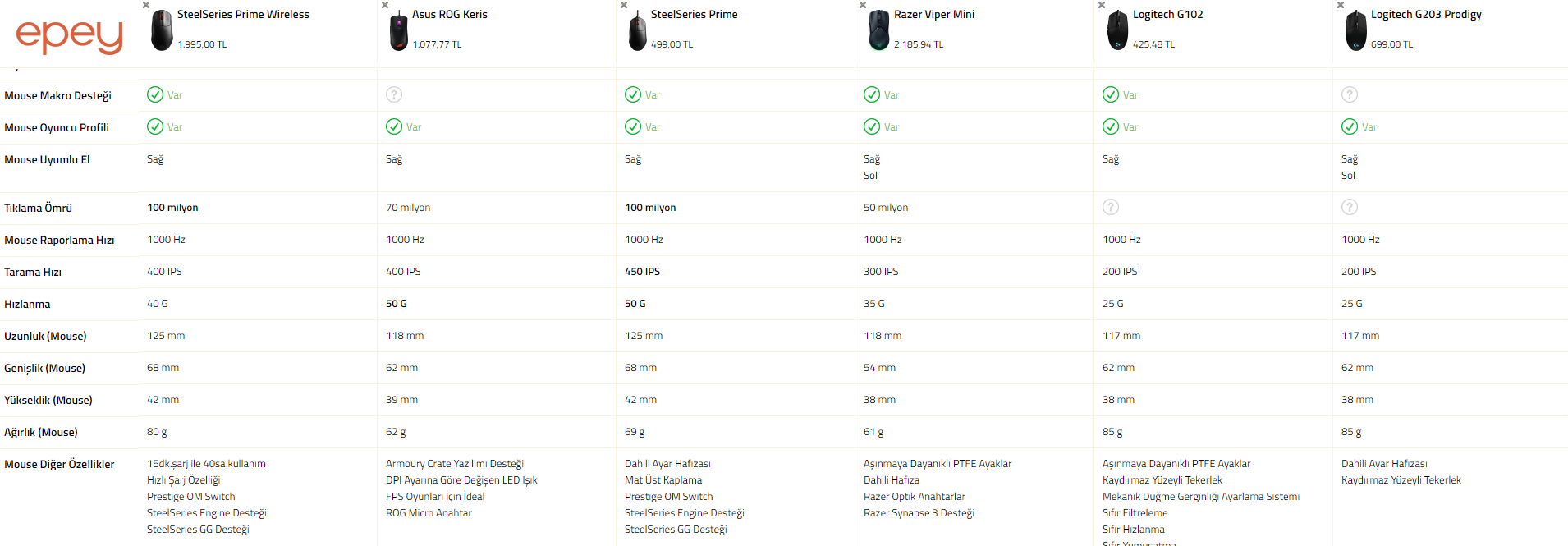 Evet hızlanma ve tarama hızının fazla olması önemli ama bana kalırsa en önemli 3 şey: Switch kalitesi, ergonomi, ağırlık. Eğer elin 19 Cm'den büyükse Prime al geç derim G102'yi denedim güzeldi ama kronik sıkıntıları vardı scroll çift tıklama vb. Ayrıca Razer'ların malzeme kalitesi logitech ya da SteelSeries kadar iyi olmuyor maalesef. Prime f/p ürünü bence pişman olmazsınız