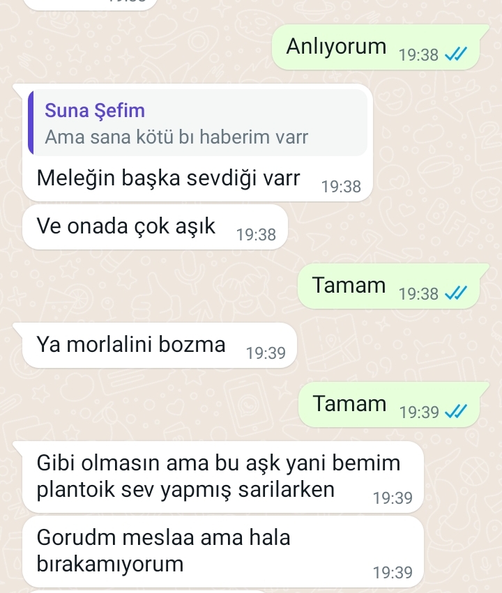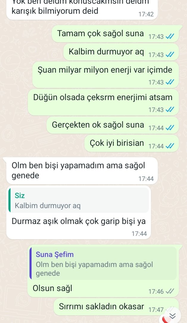 Ustam şuan hala aynı sınıftayım kızla 10 a geçtik. Öyle bir durumdayım ki anlatamam 5 ayda nerden nereye geldim. Dış görünüşüme çekidüzen verdim sosyal anksiyetemi yendim hayat çok güzel gelmeye başladı. Kız ve onun başka bir kız arkadaşıyla hergün görüşüp konuşup yazışıyorduk. Onun arkadaşına ona aşık olduğumu söylediğim de onun başkasına platonik olup çok sevdiğini söyledi. Bende kendimi tutamayıp ona açıldım. sana bunu zorla mı yaptırıyorlar diyip dalga geçiyorum sandı sonra sessizleşti ve gitti. 1 2 saat sonra bunları hiç duymamış gibi devam etti. Bugünde normal şekilde yazışıp konuşuyoruz. Sanırım aramız bozulmasın diye böyle yapıyor. Whattsapp yazışmalarını technopata atmak serbest ise atayım mı?
