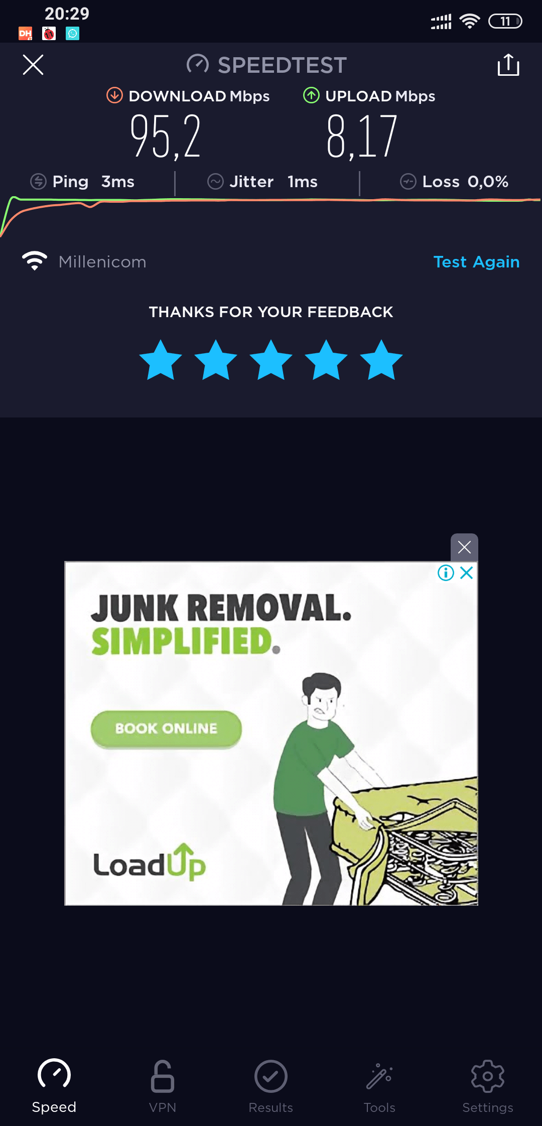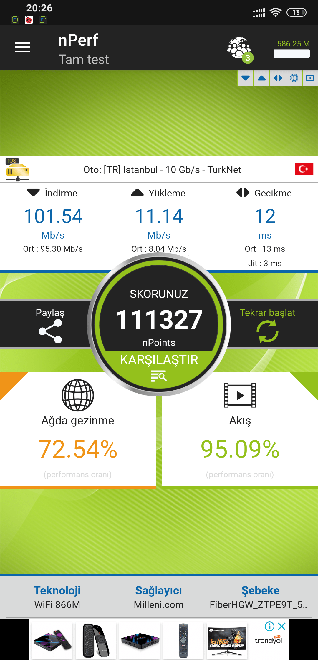 FTTH Türk Telekom altyapısında Millenicom 100 Mbps internet abonesiyim. Tesadüfen test yaparken fark ettim ve acayip mutlu oldum. Superonline gibi 20 Mbps olsa idi tadndan yenmezdi...