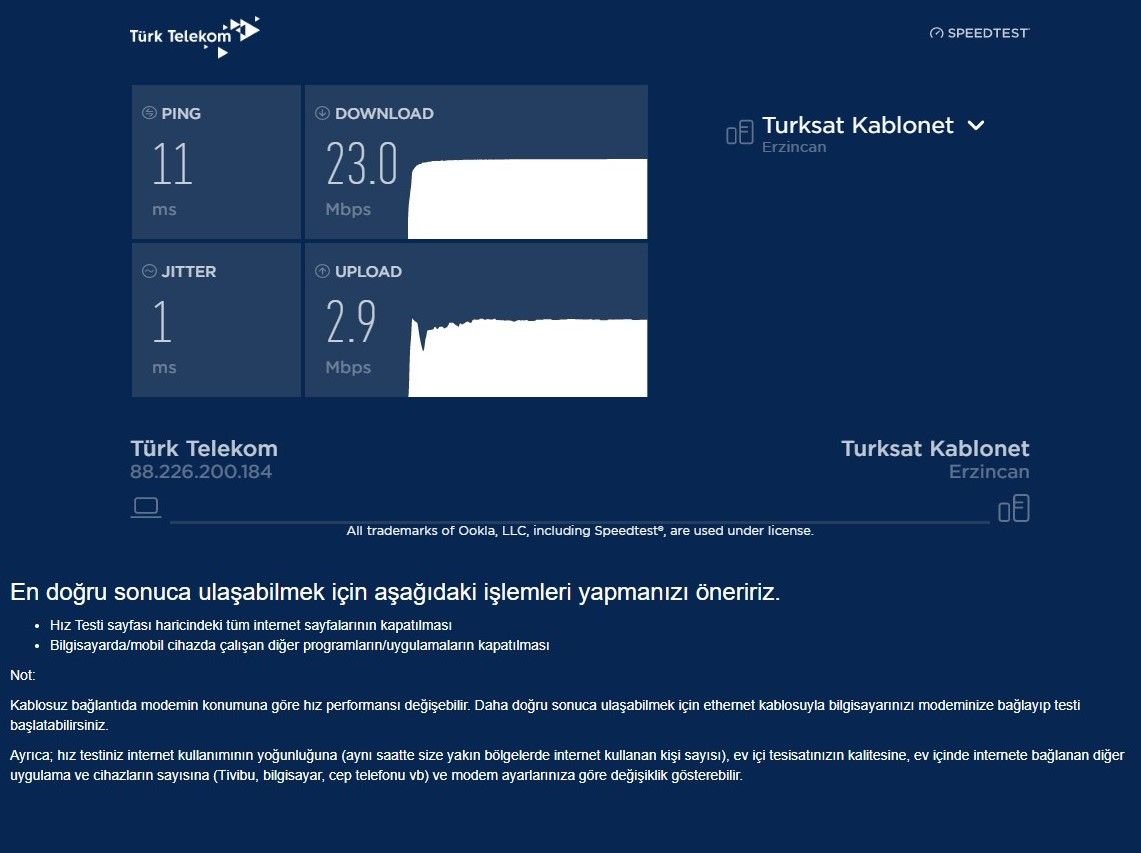 Superonline'dan beni yavaşlığı ile kanser ettiği için TürkNet'e geçtim. Superonline'da 4 mbps alabiliyordum. Alt yapımın 20 mbps ' yi desteklediğini söylediler. Fakat şuan indirme hızım 4 mbps den 1 mbps ye , upload ise 0.5 mbps den 0.1 mbps ye düştü. Teşekkürler TürkNet...