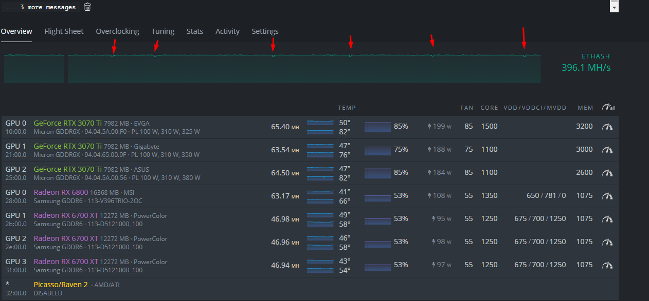 3070 Ti 3 adet kartım var ve bunlar genel olarak 62-65 arası kazım yapıyor. Bir kaç saatte bir bir tanesi 48 MH düşüp 5 dakika sonra tekrar yükseliyor. Aynı problemi yaşayan var mı? Yada çözümü bilen varsa şimdiden teşekkürler.
