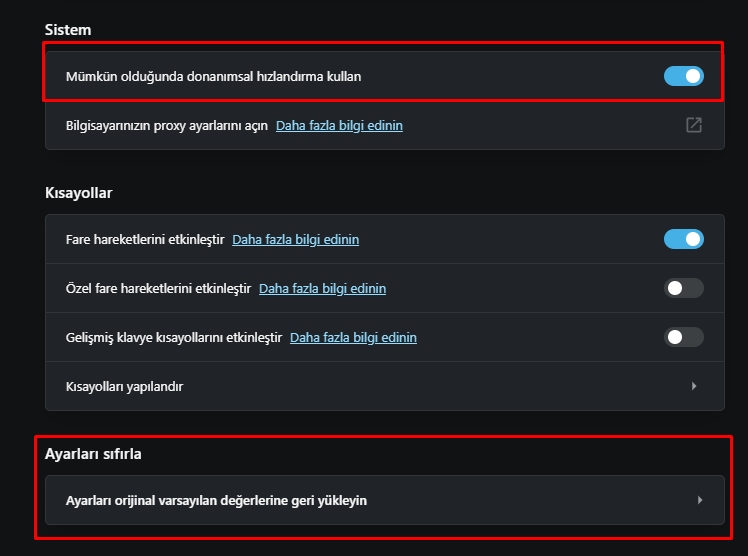 Tarayıcını sıfırlamayı deneyin. Olmazsa donanım hızlandırma ayarını kapatın.