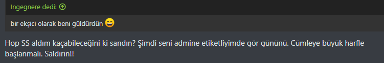 Ingegnere dedi: Bir Ekşici olarak beni güldürdün Genişletmek için tıkla... Hop SS aldım kaçabileceğini ki sandın? Şimdi seni admine etiketleyeyim de gör gününü. Cümleye büyük harfle başlanmalı. Saldırın!