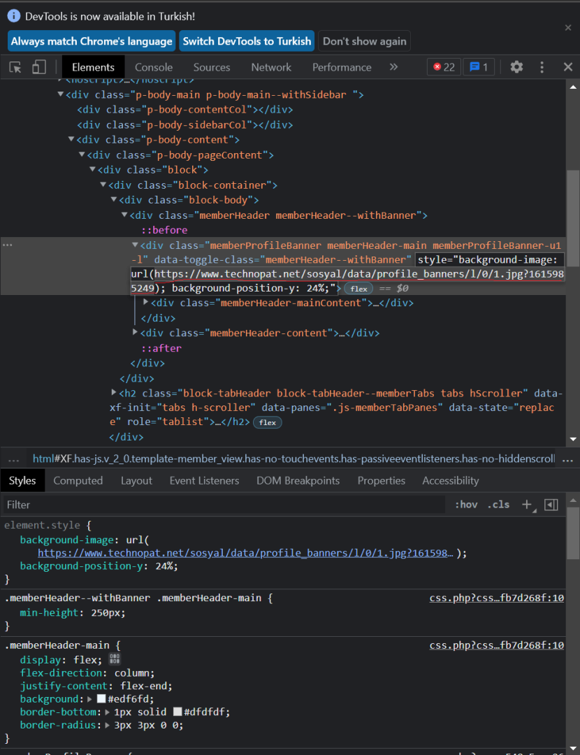 4. Gelen komut satırında ise bulmamız gereken yer "memberProfileBanner" başlığı, o bölüme 2 kez dokunursanız komut dizinini kopyalayabilir veya değiştirebilirsiniz, sizin orada kopyalamanız gereken yer "background-image: url" karşısındaki güzeller güzeli link. (mavi ile işaretli yer link)