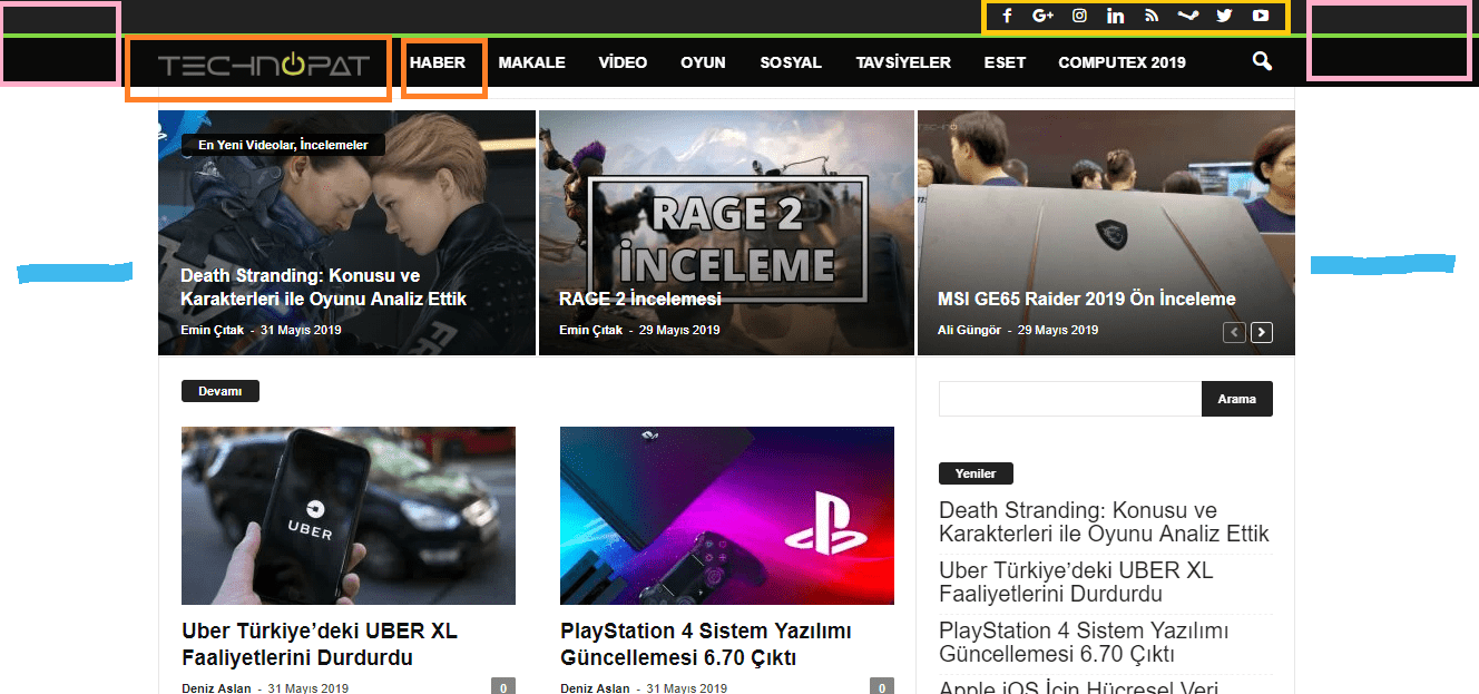 • Sarı kutu: O ikonlar orada olmamalı, bakmak isteyen sayfa altına iniyor, tasarım standartıdır. Ayrıca üst menüyü gereksiz kaplıyor.