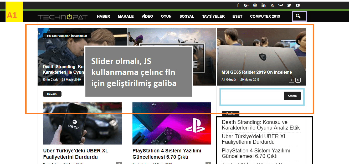 Üst tarafta arama tuşu varken şuraya da bir tane arama için alan koymak gereksiz yere yer kaplamış. Onun altındaki Yeniler bölümününde kaldırılması lazım, görsel olmadığı için hiç dikkat çekmiyor ve sadece kirlilik yaratıyor. Aynı zamanda sayfayı ne kadar aşağı indirirsek indirelim o hep yan tarafta duruyor gitmiyor onu siteden tamamen kaldıramayı düşünmüyorsanız pop-up şeklinde bir şey yapın.