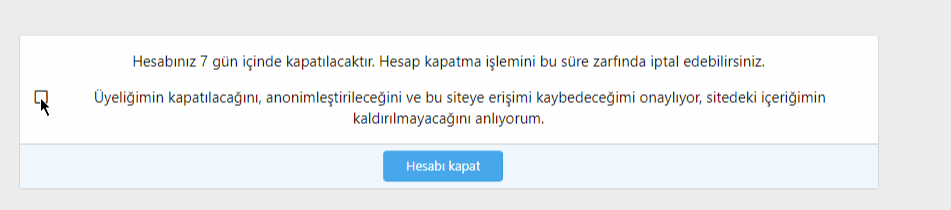 6. Geçerli bir neden girdikten sonra onayla tuşuna bastığınızda sistem sizi hesaptan atacaktır ve 7 gün içerisinde hesabınızı anonimleştirip kapatacaktır. 7 gün içerisinde hesabınıza tekrardan giriş yapıp Hesap Kapatma işlemini iptal edebilirsiniz. İptal ettikten sonra belli bir süreliğine tekrardan hesap kapatma isteği gönderemezsiniz. Yeniden kapatma isteği gönderme süresi 1 aydır.