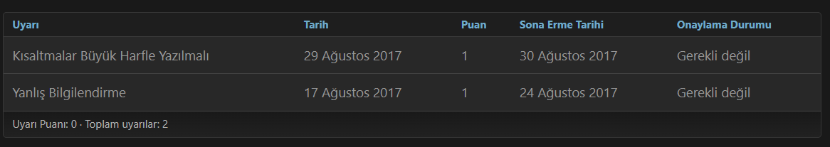 Uzun zamandır aktif değildim ve mesaj yazmıyordum. Bu konuyu görünce bir bakayım dedim. Benim uyarılar olduğu gibi duruyor. Şu saatten sonra uyarılar silinmiş silinmemiş bu benim umurumda mı derseniz değil. Size iyi forumlar.