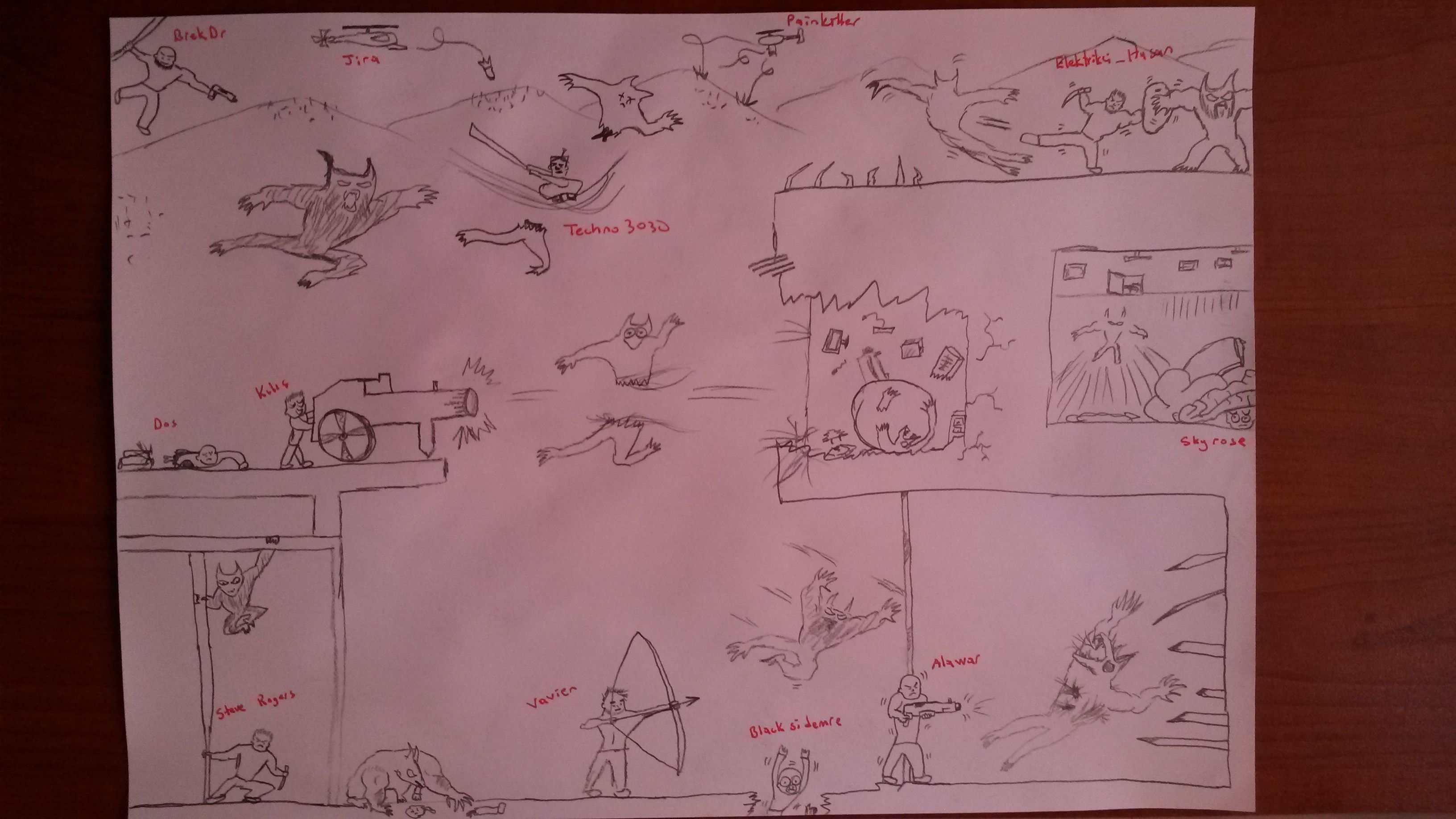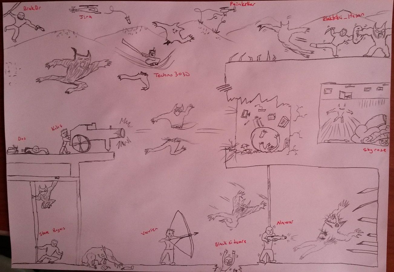 Resimdeki anlaşılmayan durumlar olabilir. Kurt adamlar köyü basmış biz Technopat sakinleri de savunmaya çalışıyoruz. Arkadaki dağlardaki noktalar, köye doğru koşan kurt adam sürüsü sağ olsun 2 arkadaşımız savaş helikopterleriyle işlerini bitirip işin çoğunluğunu üstleniyorlar. Geride kalanları da biz hallediyoruz. Bu sıralar Dos, Kılıç ile çok uğraştığın için o haldesin adamımla uğraşma bundan sonra