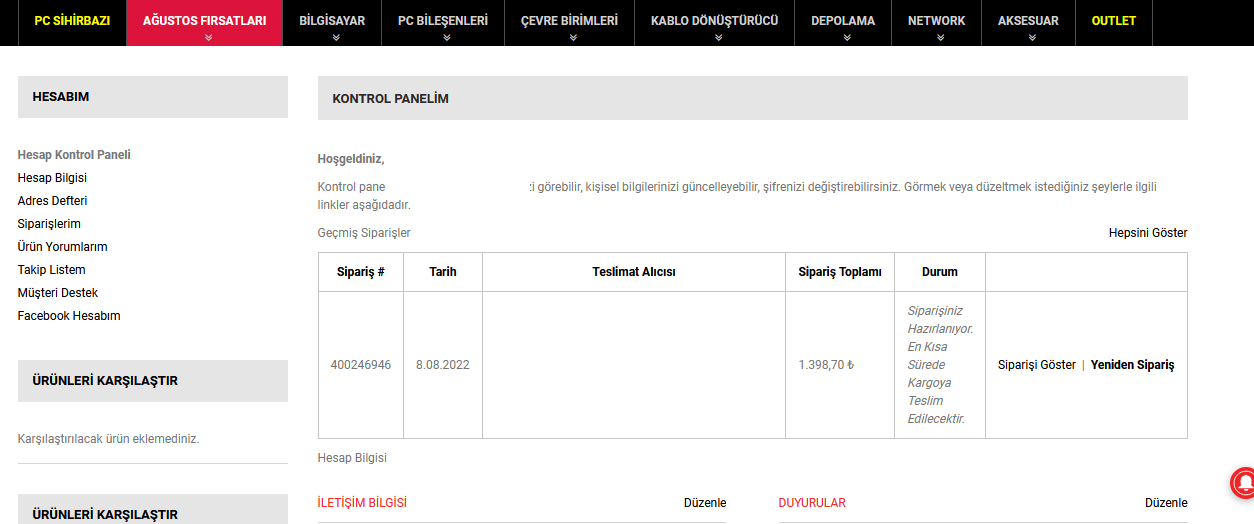 Ayrıca ürünlerim geldiği halde hala sitesinde "Siparişiniz Hazırlanıyor. En Kısa Sürede Kargoya Teslim Edilecektir." diye yazıyor. nasıl bir sorumsuzluktur bu yahu.